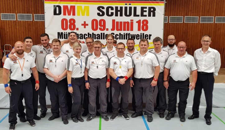 (Die Kampfrichter der DM weibliche Jugend – Foto: Marion Stein)Die Mannschaftsmeisterschaft der Schüler wurde im saarländischen Hüttigweiler ausgetragen. Vor Ort verantwortlich für die Kampfrichter war Uwe Manz. Die dort ausgetragenen Mannschaftskämpfe würden auch hier sicher und ohne große Vorfälle ausgetragen. Trotz der sehr sommerlichen Temperaturen in der Halle, gelang es auch hier dem Veranstalter einen reibungslosen Turnierverlauf zu gewährleisten.